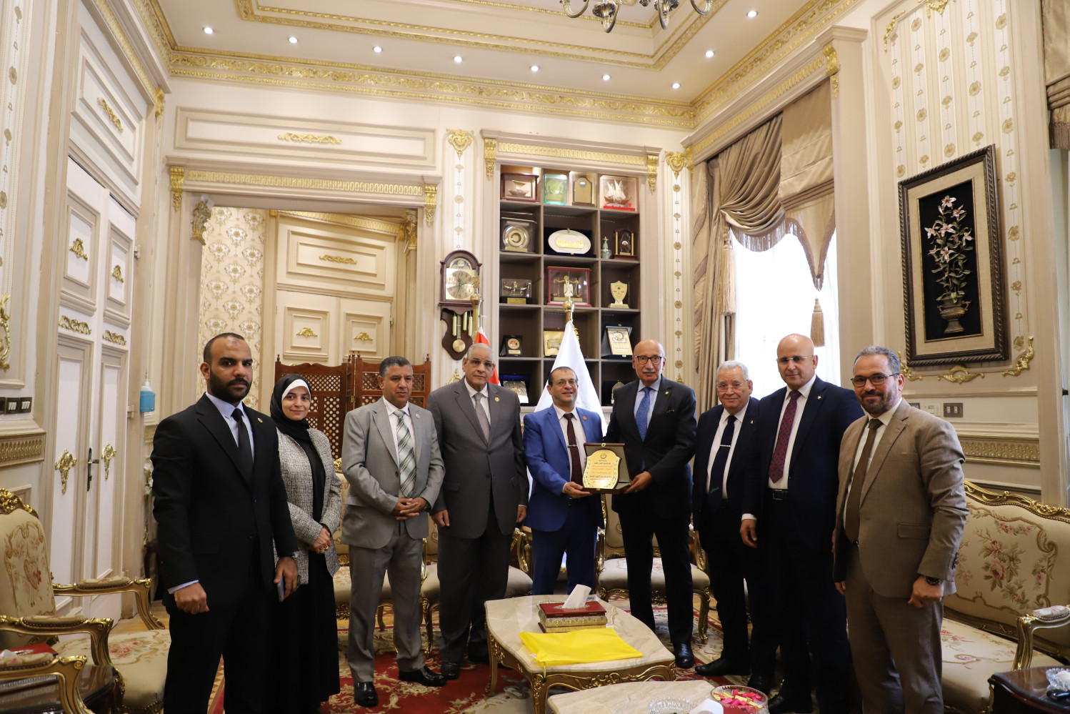 وقد صاحب سعادة العميد وفداً من السادة أعضاء هيئة التدريس رفيع المستوى ضم كل من الأستاذ الدكتور/ ذكري عبد الرازق خليفة وكيل الكلية للدراسات العليا والبحوث، الأستاذ الدكتور/ عبد الله النجار عضو مجمع البحوث الإسلامية، الأستاذة الدكتورة/ فريدة محمد علي عميد كلية الدراسات الإسلامية والعربية للبنات بالقاهرة، الأستاذ الدكتور/ أحمد السنتريسي رئيس قسم القانون العام، الأستاذ الدكتور/ عاشور عبد الرحمن رئيس قسم القانون الخاص، الأستاذ الدكتور/ عبد الرؤوف جاد عيوش عضو هيئة التدريس بالكلية، المستشار الدكتور/ وائل محمد كريم وكيل هيئة قضايا الدولة.