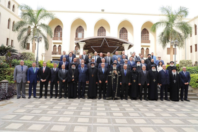 حيث كان في استقبالهم قداسة البابا تواضروس الثاني، بابا الإسكندرية وبطريرك الكرازة المرقسية، وعدد من الآباء الأساقفة ضم كلاً من صحاب النيافة الأنبا يوليوس الأسقف العام لمصر القديمة وأسقفية الخدمات العامة والاجتماعية، والأنبا أنجيلوس الأسقف العام لكنائس قطاع شبرا الشمالية، والأنبا ماركوس أسقف دمياط وكفر الشيخ والبراري ورئيس دير القديسة دميانة بالبراري، وسكرتير مساعد المجمع المقدس، والأنبا ميخائيل أسقف حلوان والمعصرة، والأنبا فيلوباتير أسقف أبوقرقاص، بمحافظة المنيا، والقمص سرجيوس سرجيوس وكيل عام البطريركية بالقاهرة، والراهب القس عمانوئيل المحرقي مدير مكتب قداسة البابا، والقمص موسى إبراهيم المتحدث باسم الكنيسة القبطية الأرثوذكسية، والقس رافائيل رمزي والشماس جوزيف رضا من سكرتارية قداسة البابا، والسيدة بربارة سليمان مدير المكتب البابوي للمشروعات والعلاقات.